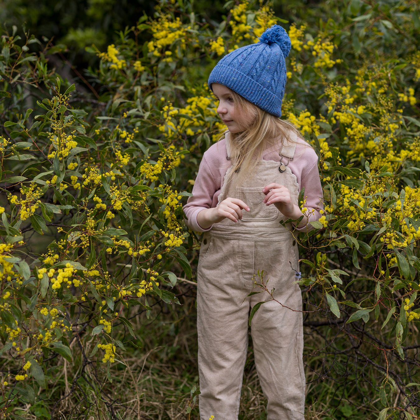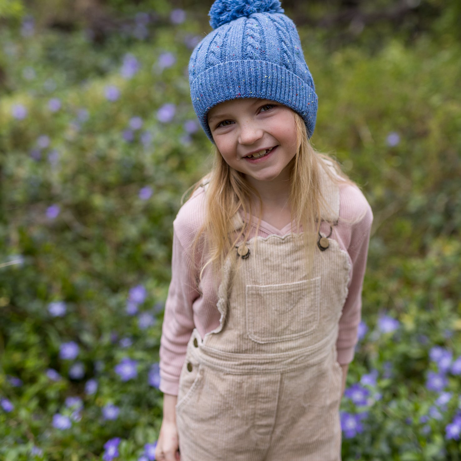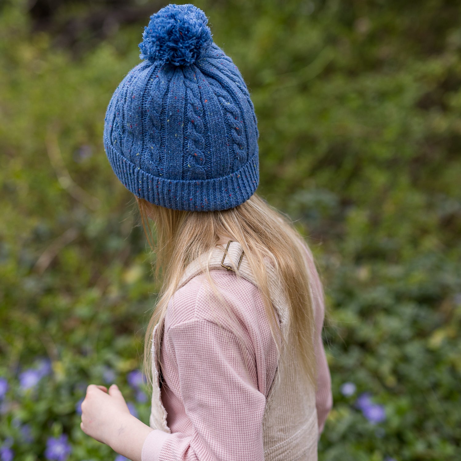 This sweet beanie is made with a lovely pale pink yarn with a fun speckled pop of colour throughout. A classic cable knit pattern with a very stretchy and comfortable rolled ribbing at the face and a fun pom pom on top.