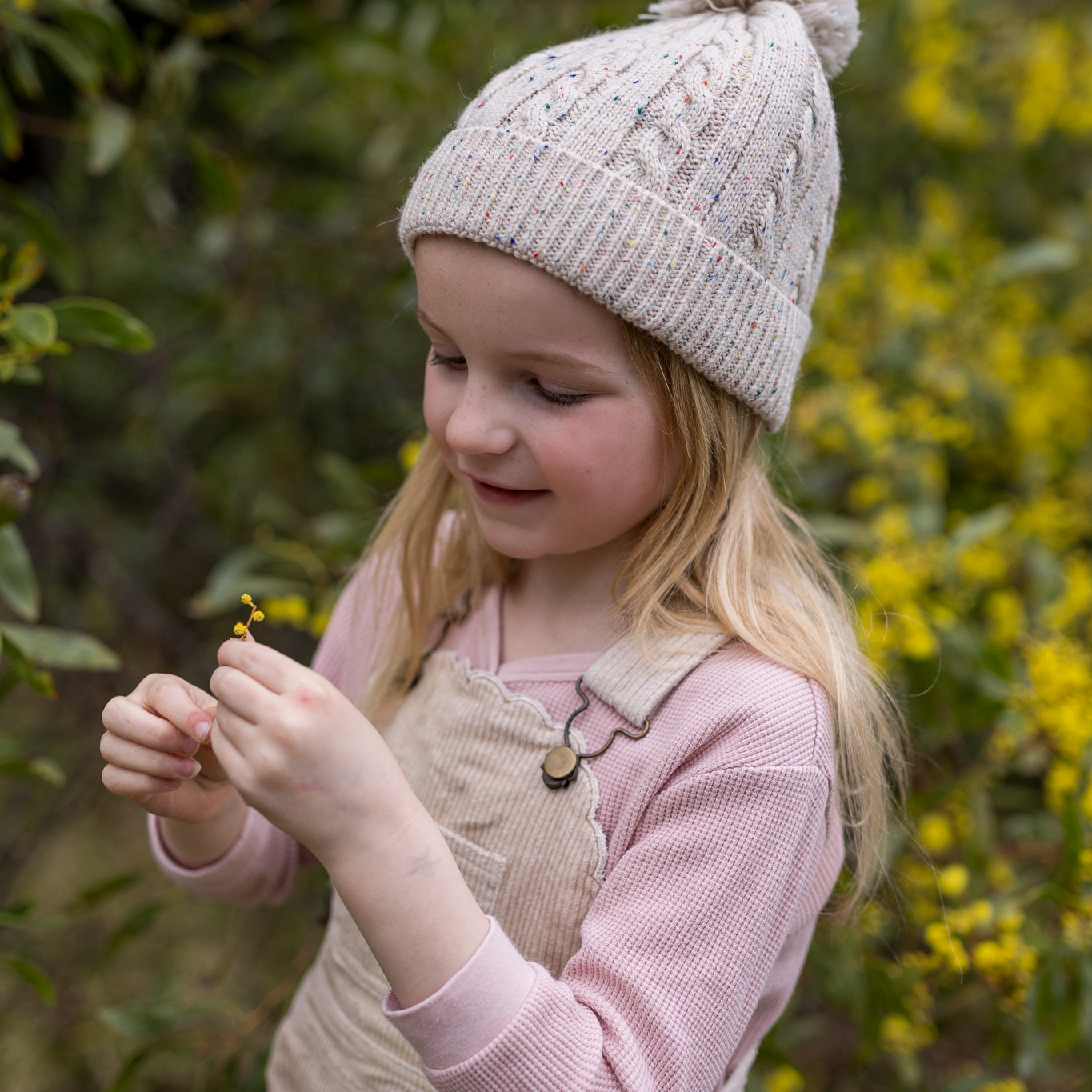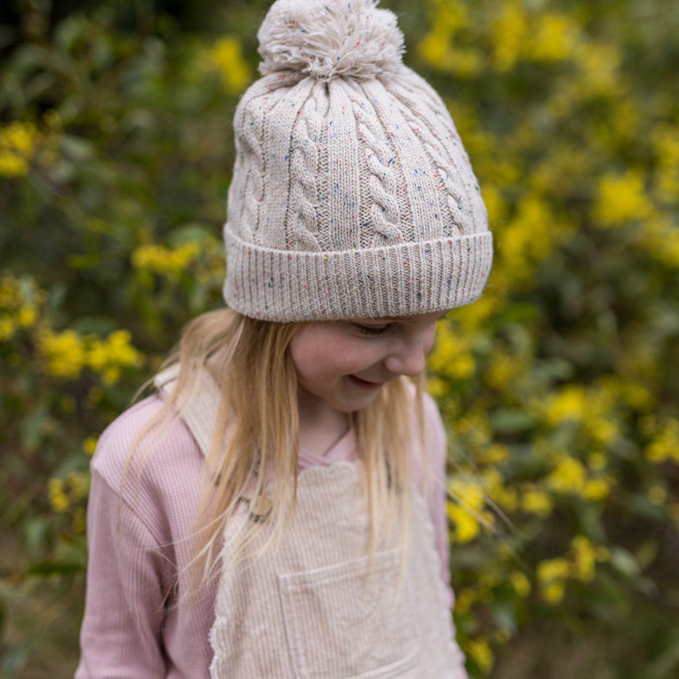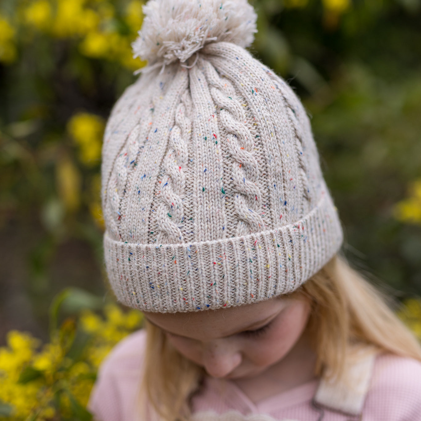 This sweet beanie is made with a lovely pale pink yarn with a fun speckled pop of colour throughout. A classic cable knit pattern with a very stretchy and comfortable rolled ribbing at the face and a fun pom pom on top.