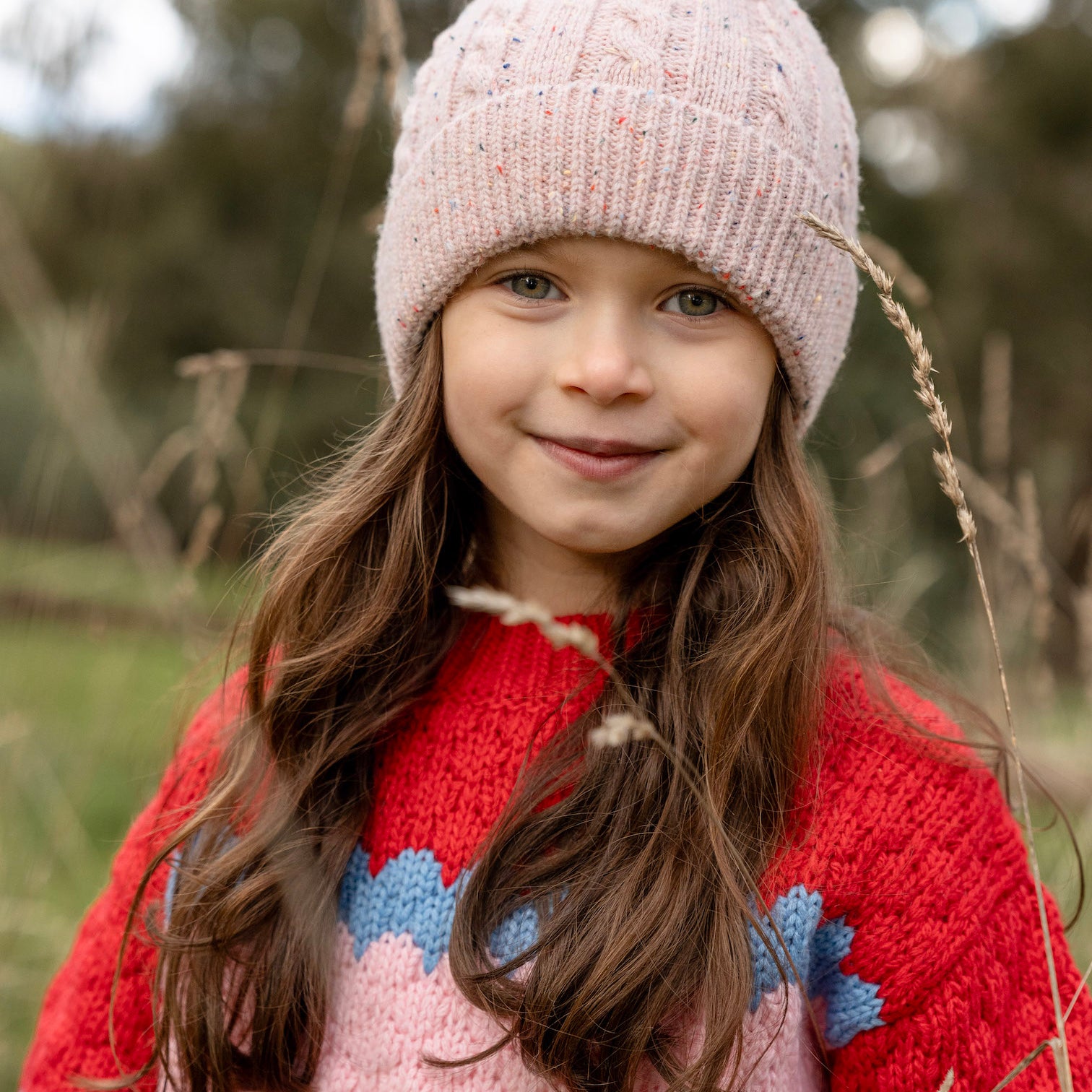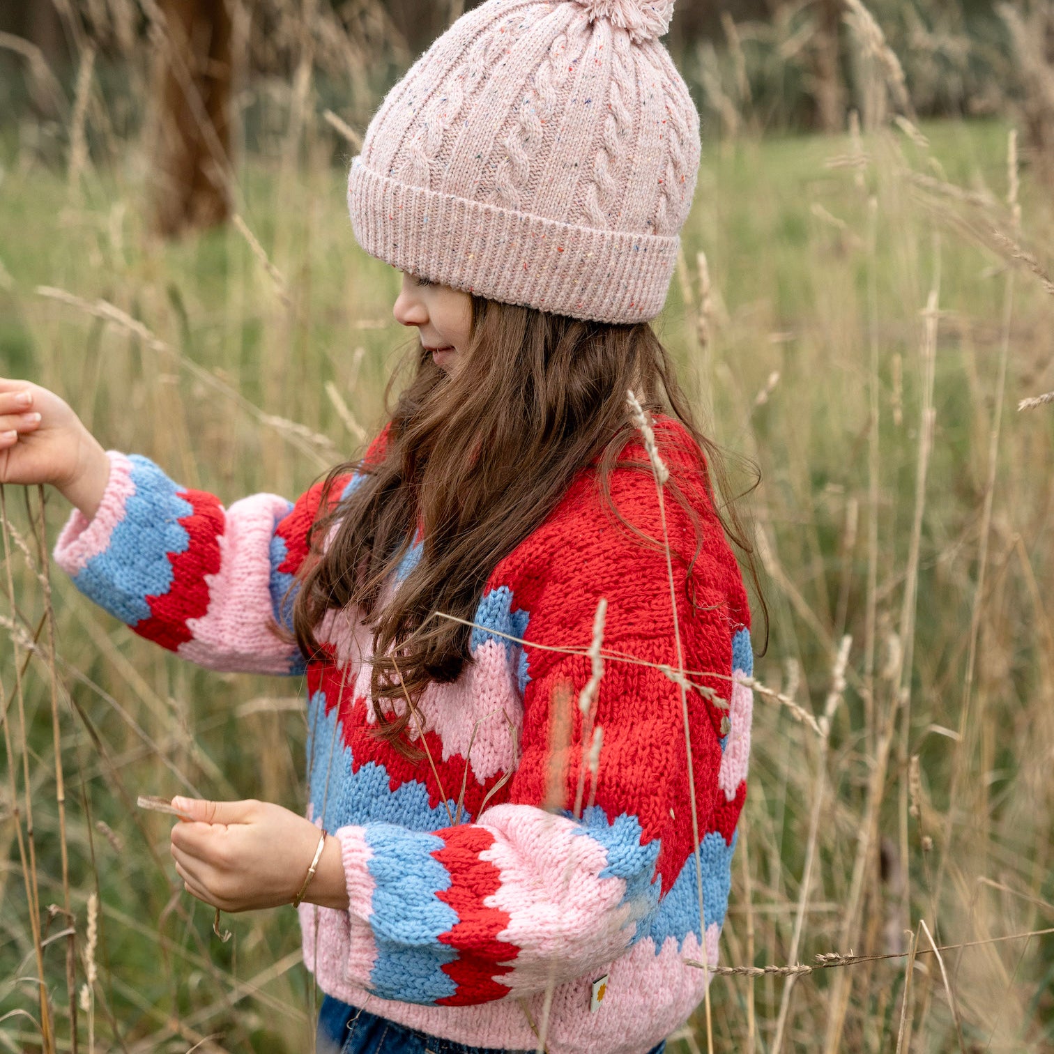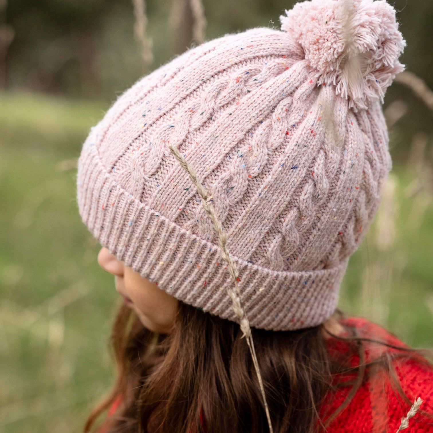 This sweet beanie is made with a lovely pale pink yarn with a fun speckled pop of colour throughout. A classic cable knit pattern with a very stretchy and comfortable rolled ribbing at the face and a fun pom pom on top.