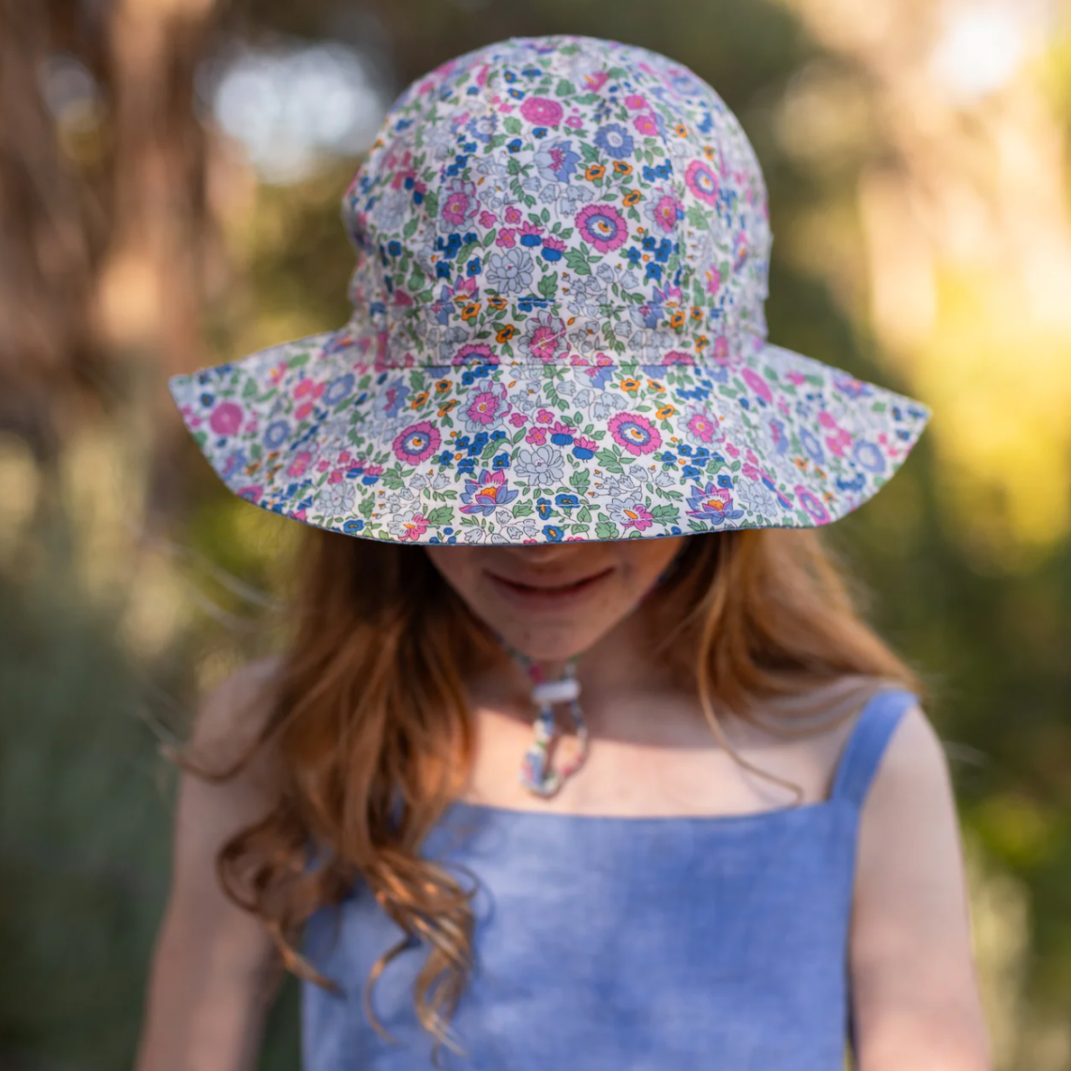The prettiest sunhat with a pink and purple floral print on the outside and a blue and white polka dot print on the inner brim.