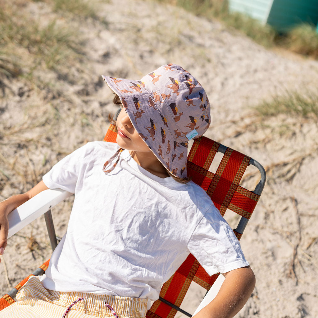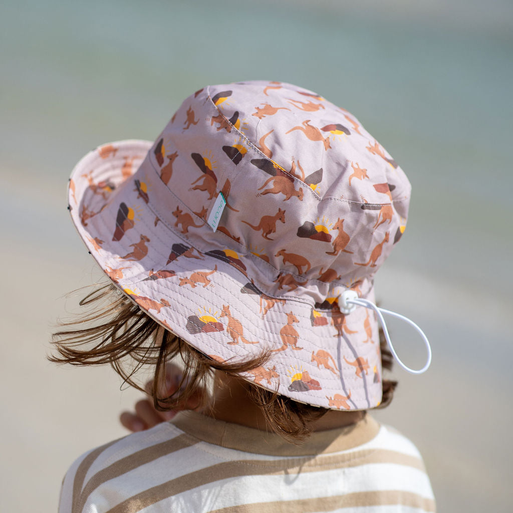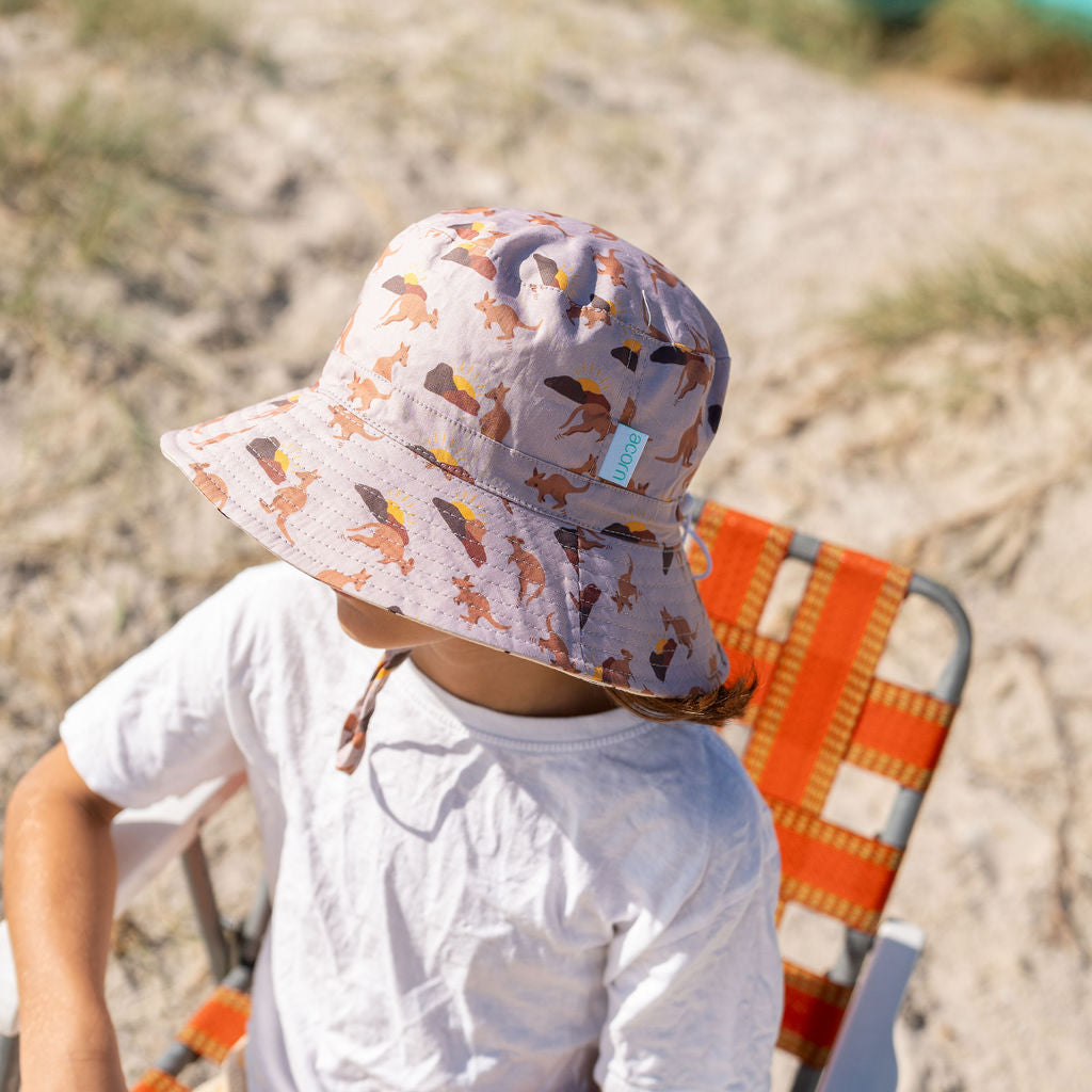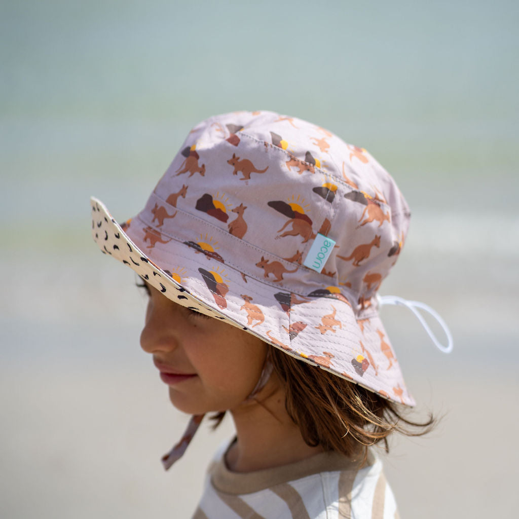 Get set for summer time fun with this a super cool Australian print featuring a sunset and kangaroos on the outside and a cream and black dashes print on the inner brim. The original artwork was designed in Melbourne by artist Jacinta Weir.