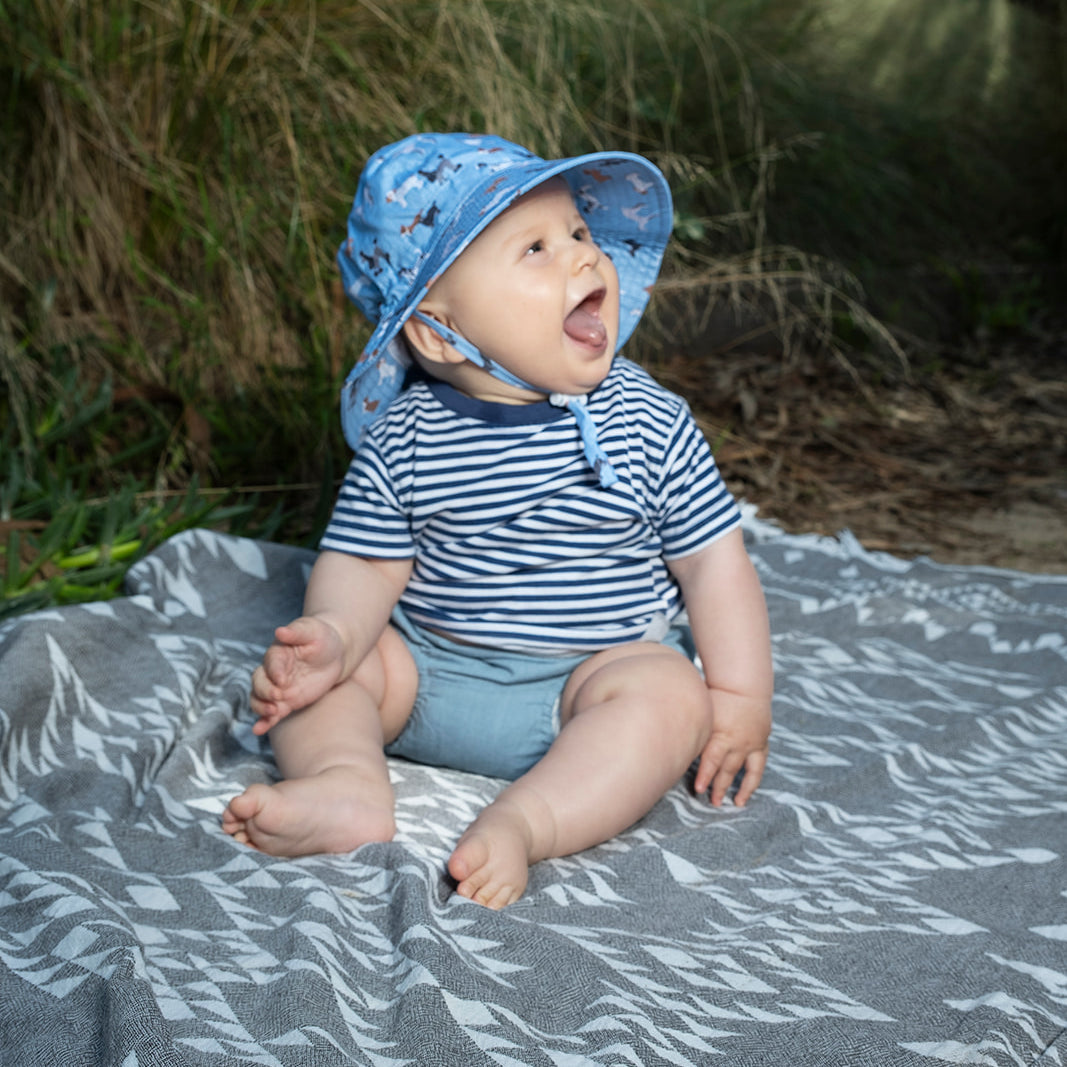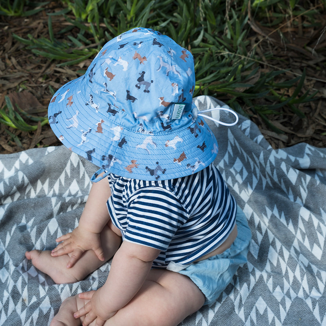 A super cute infant sun hat with a blue based cute doggies print designed by Jacinta Weir from Two Litte Ducklings.