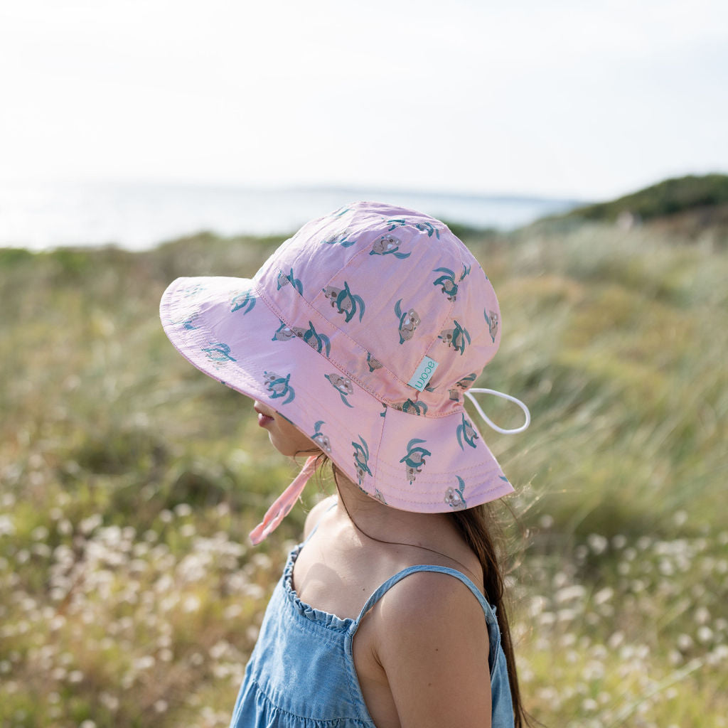A must-have hat this summer with the cutest little Australian marsupial! This adorable sunhat features a pink Koala print on the outside and on the inner brim.