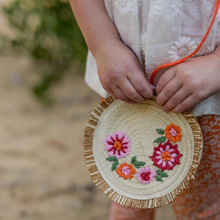 Straw bag with a cute flower embroidery and trim.