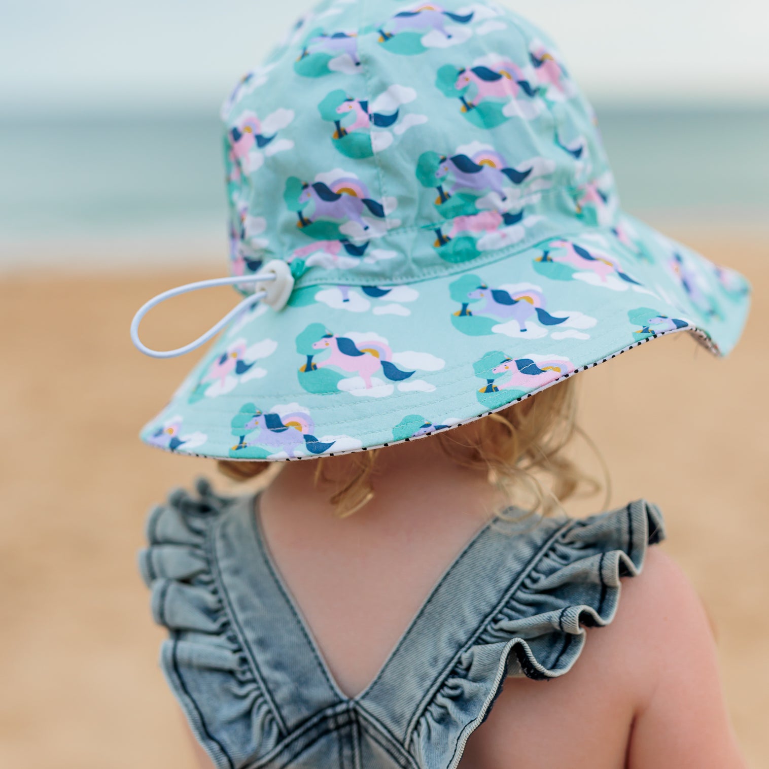 The Dancing Unicorn floppy hat features a cute print designed by Jacinta Weir from Two Little Ducklings on a mint base and a black and white polka dots print in the inner brim.