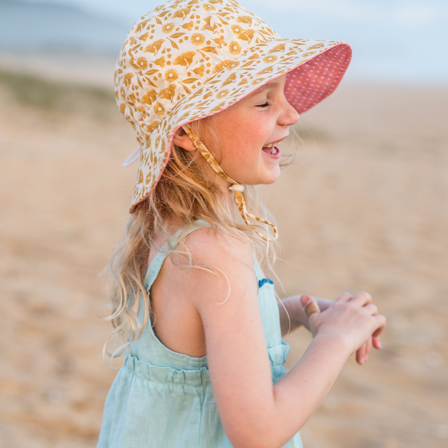 Floppy hat with a golden Australian native flora print on the outside and a pink and white polka dot print in the inner brim.