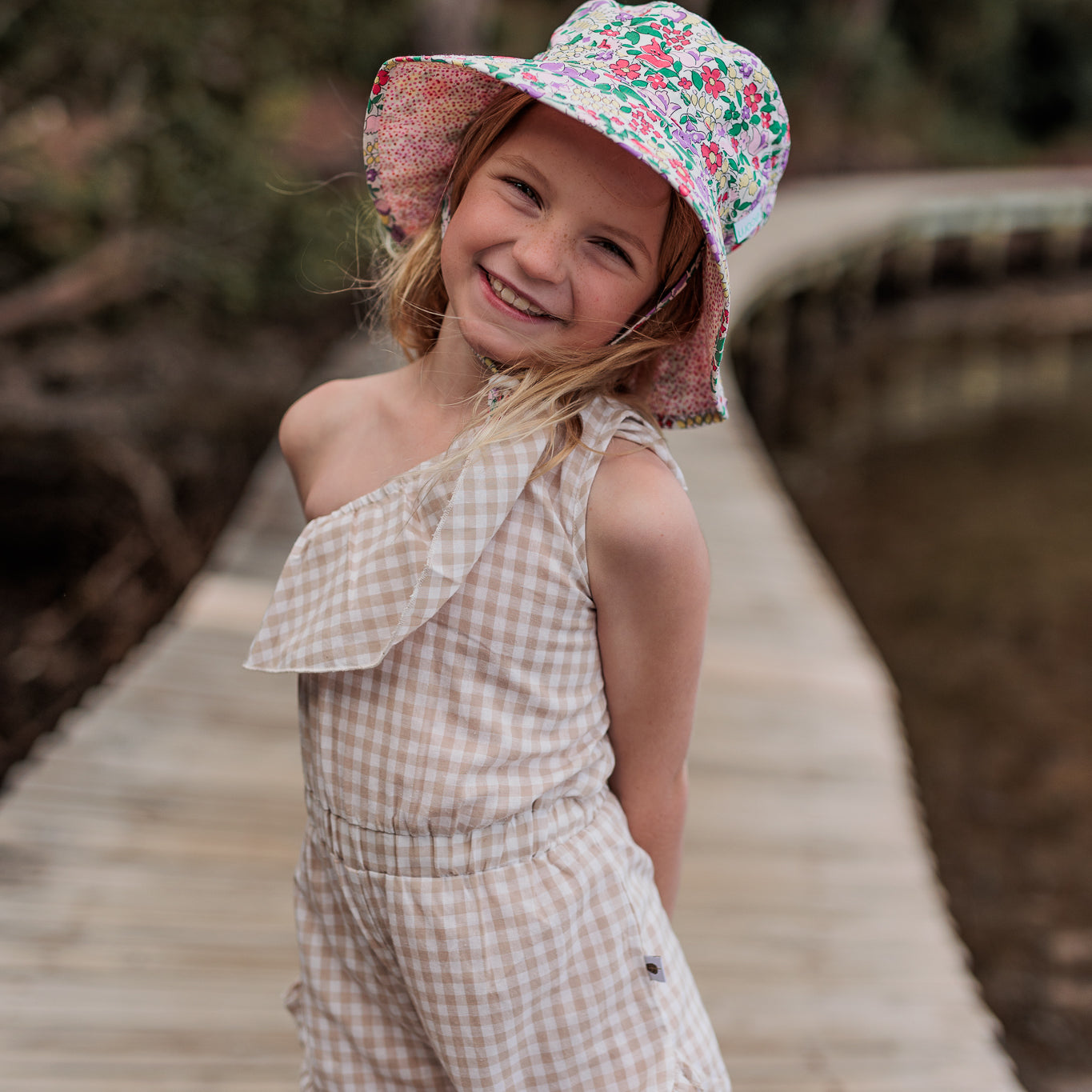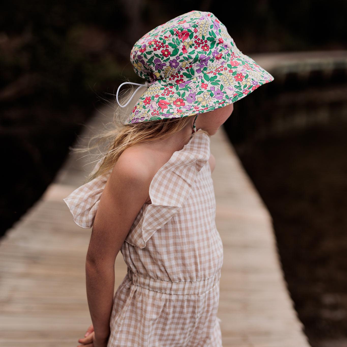 Wide Brim Bucket Hat with with a garden floral print on outside and a pink and burgendy spot print on the inner brim.