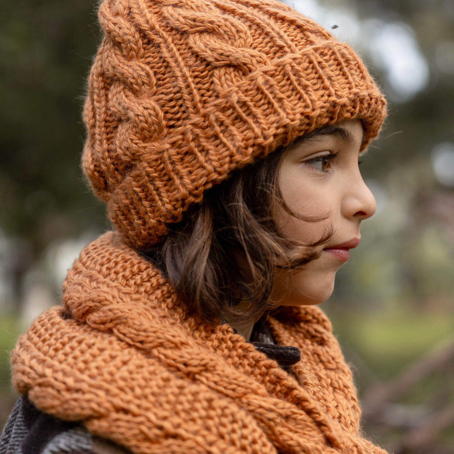 A super soft wool blend knit beanie, made with a cable knit stitch that is lovely and stretchy and extremely comfortable when worn.