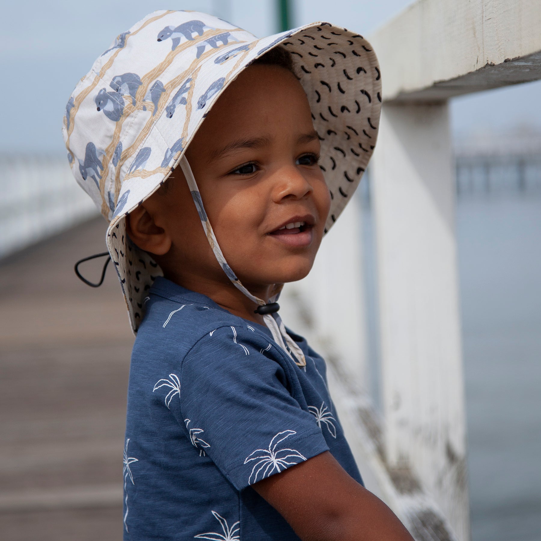 Bucket hat with a Koala print on the outside and a cream and black dashes print on the inner brim.