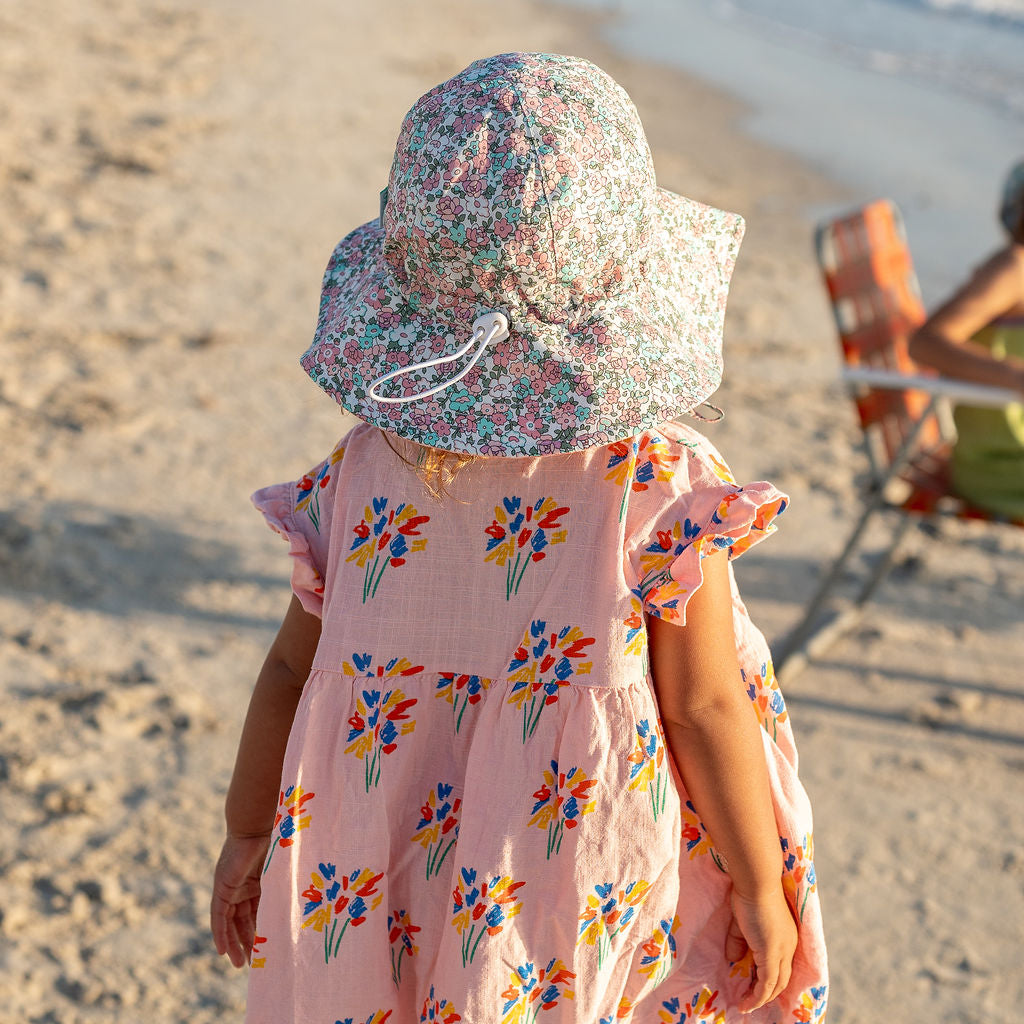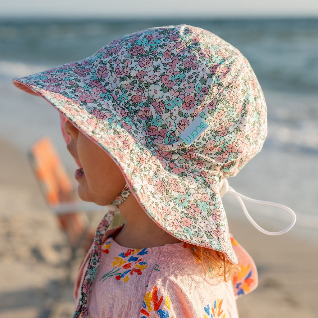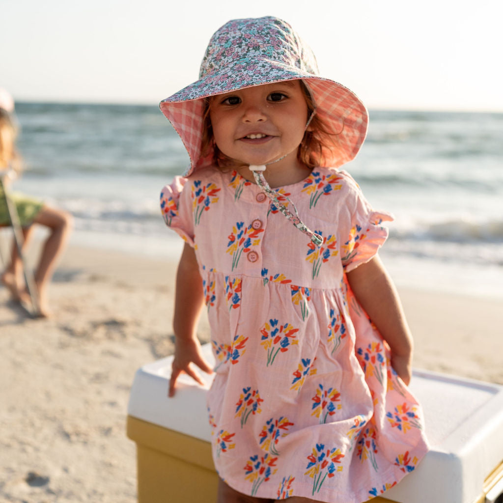 The prettiest sunhat with a pink and green floral print on the outside and a pink and cream gingham checked print on the inner brim.