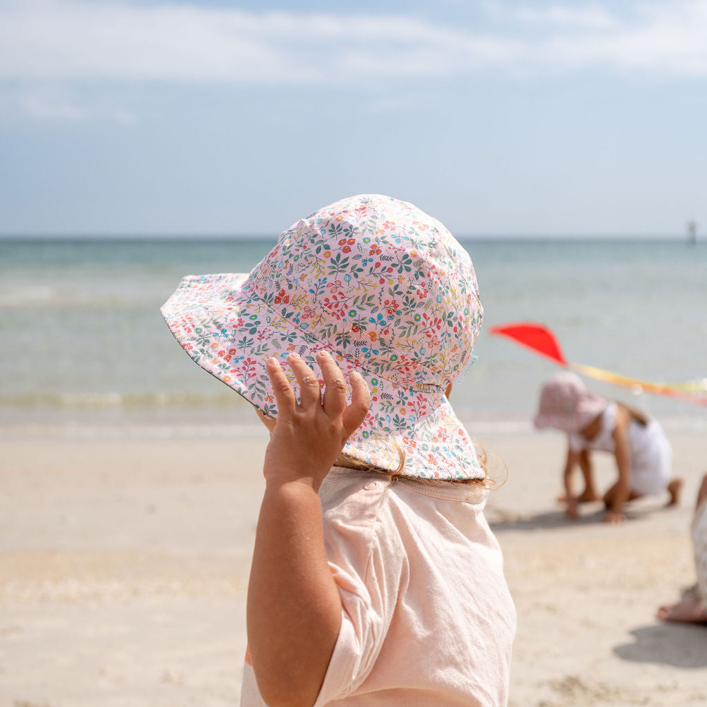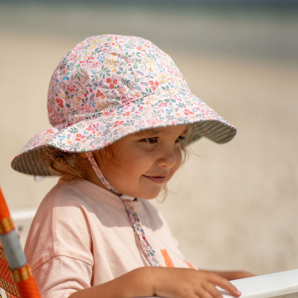This sweet sunhat features a pink floral print on the outside and a sage and white polka dot print on the inner brim.