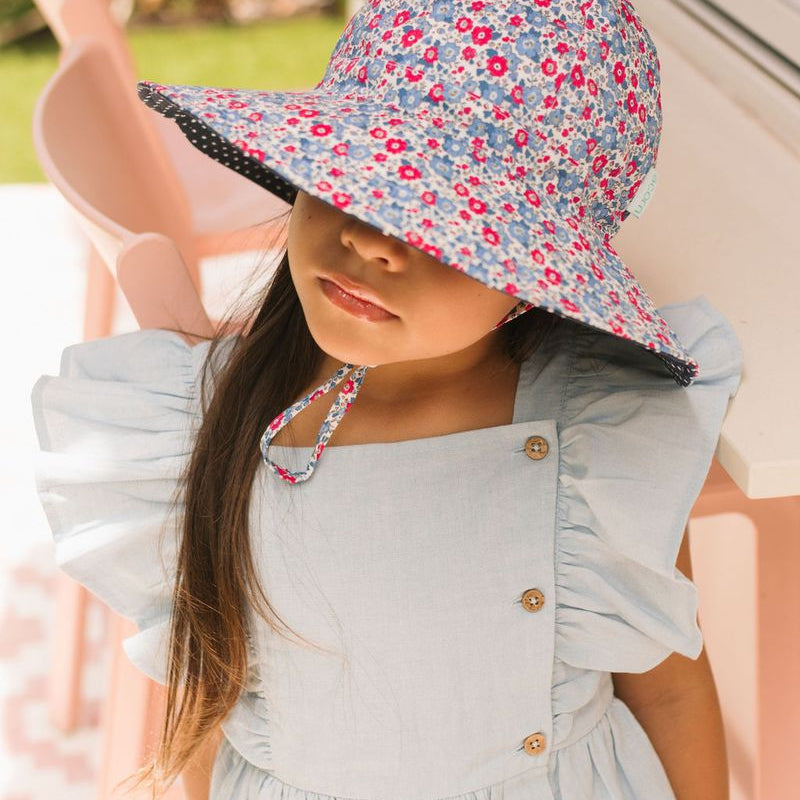 Enjoy sunny days with this wide-brim sunhat, featuring a sweet blue and red floral print on the outside and a blue-and-white polka dot print on the inner brim. A stunning design that’s ready to match with every summer adventure!