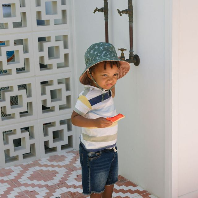 Bring a little roar to sunny days with this bucket hat featuring a bold print of lions, tigers, and cheetahs on the outside, paired with a chestnut and cream checks print on the inner brim. Both original designs are by Melbourne artist Jacinta Weir from Two Little Ducklings.
