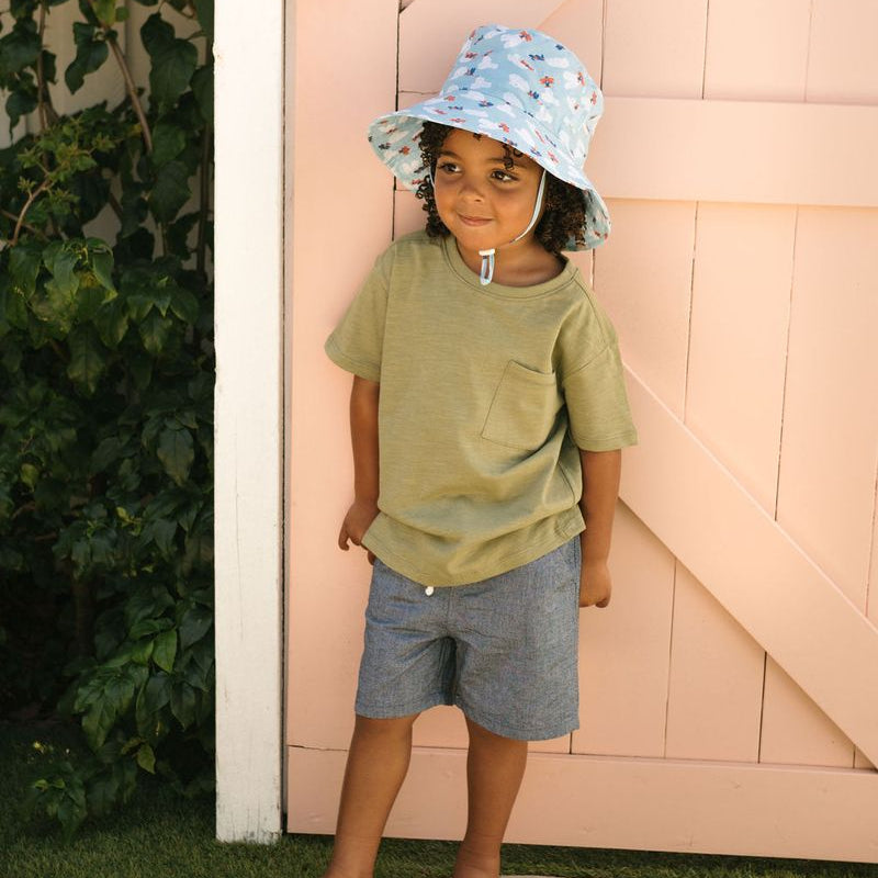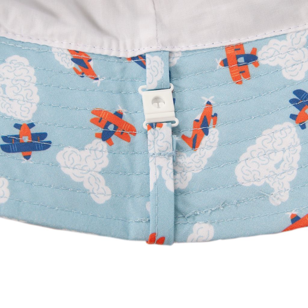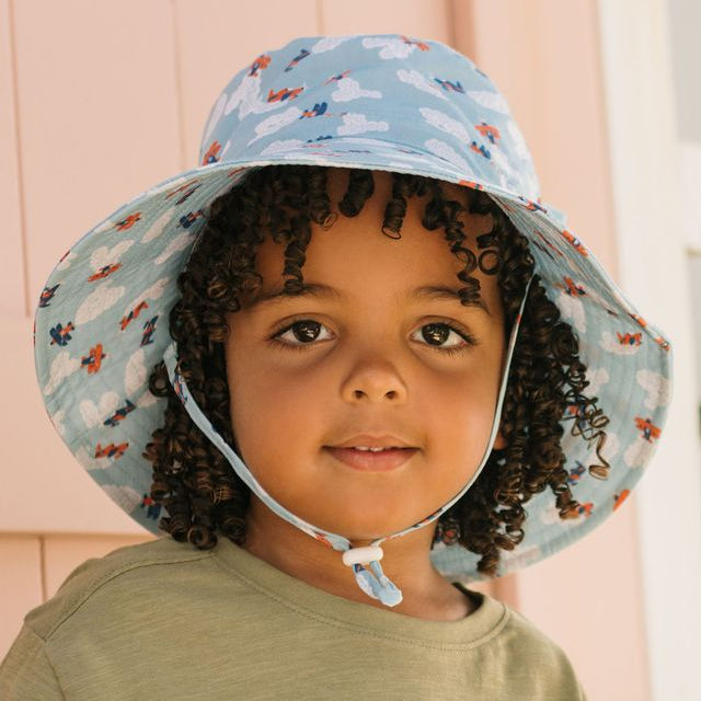 Keep little ones sun-safe in style with this bucket hat featuring a playful planes and clouds print on both the outer and inner brim. The design was created by Melbourne artist Jacinta Weir from Two Little Ducklings.