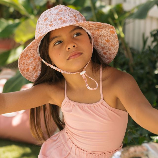 Bring a pop of colour to every summer day with this wide brim sunhat, featuring a stunning peach-toned vintage floral print on both the outside and inner brim, designed by Jacinta Weir from Two Little Ducklings. Perfect for pairing with any sunny-day outfit!