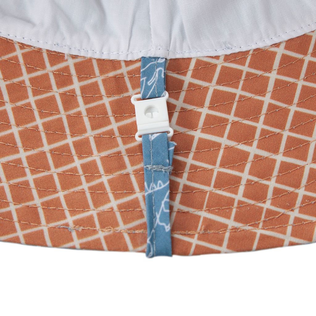 Bring a little roar to sunny days with this bucket hat featuring a bold print of lions, tigers, and cheetahs on the outside, paired with a chestnut and cream checks print on the inner brim. Both original designs are by Melbourne artist Jacinta Weir from Two Little Ducklings.