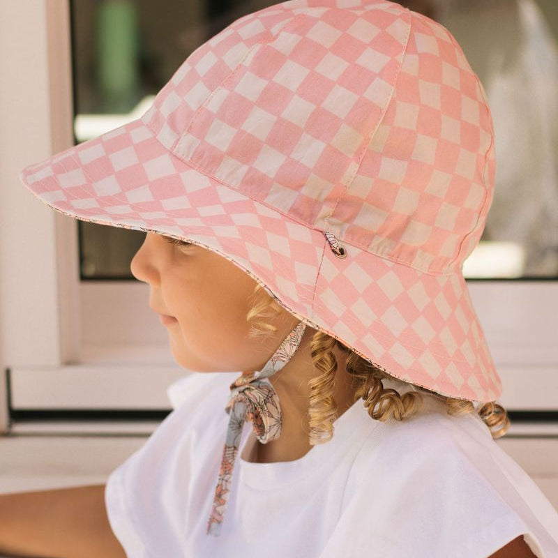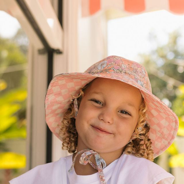A sweet reversible wide brim sunhat with a sweet pink, peach and blue floral print on the outside and our popular pink-and-cream checks print on the reverse.