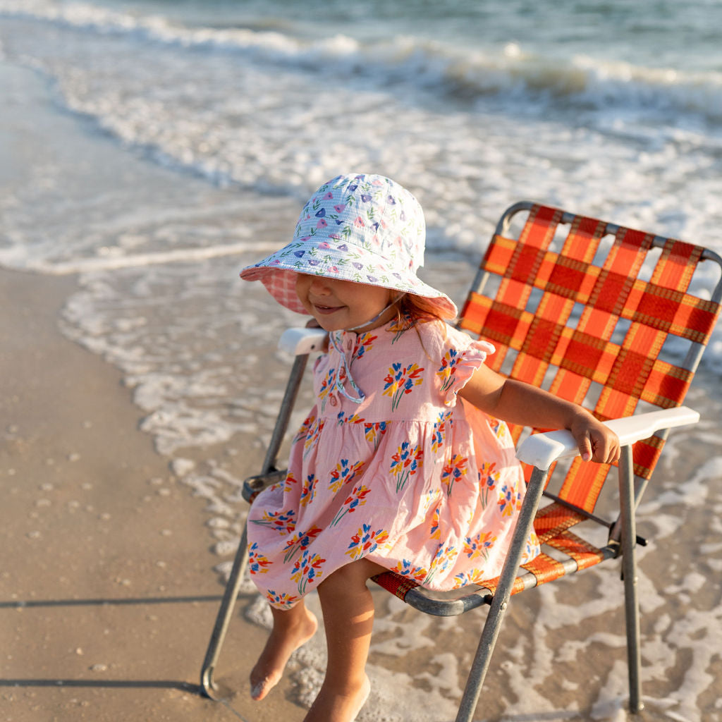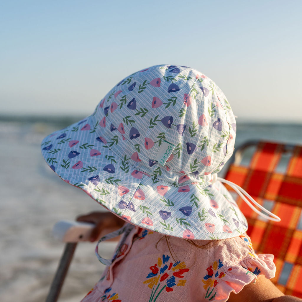This gorgeous sunhat features a sweet flowers and dashes print with blues and pinks on the outside and a pink and cream gingham check on the inner brim.