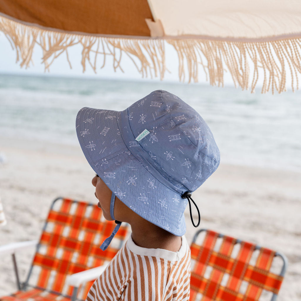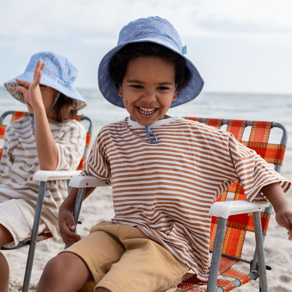 Set sail for adventure with the Row Boats Bucket Hat - designed for little explorers with big dreams! Featuring a dark blue rowing boats print on the outside and on the inner brim. The original artwork was designed in Melbourne by artist, Jacinta Weir.