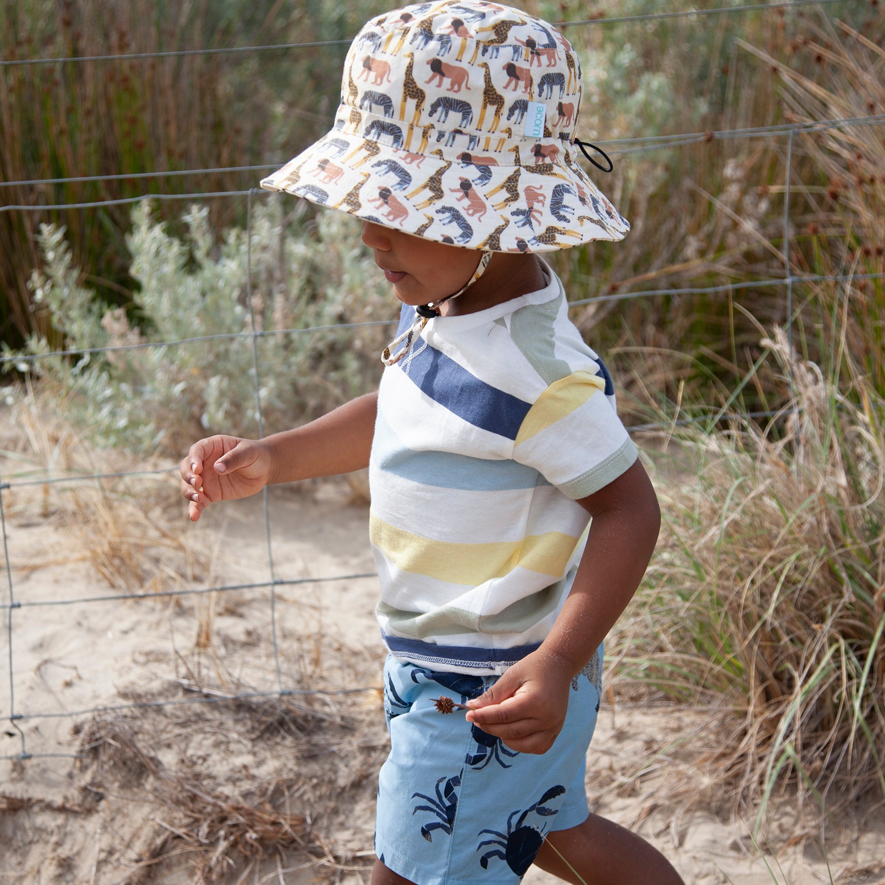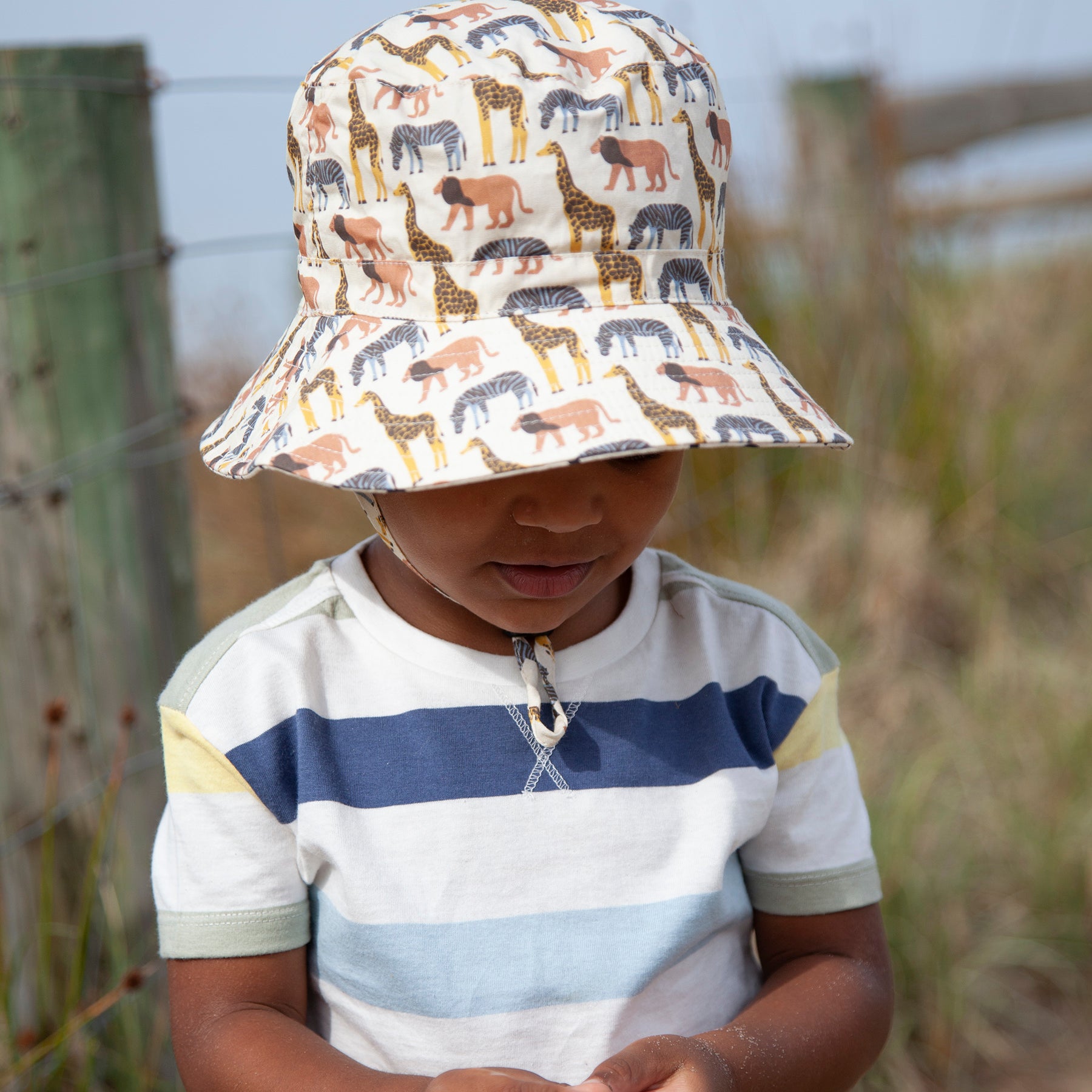 Bucket hat with a safari print on the outside and a cream and black dashed line print on the inner brim.