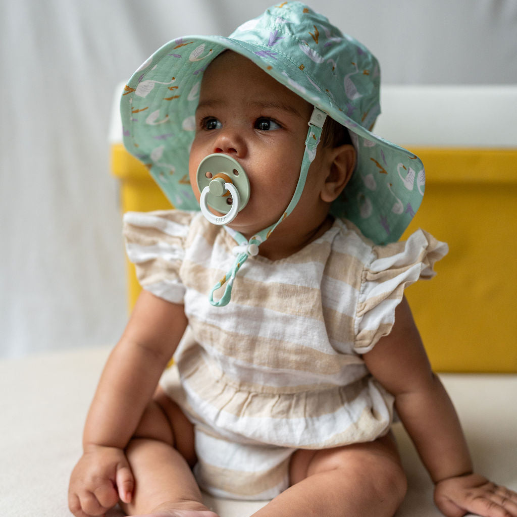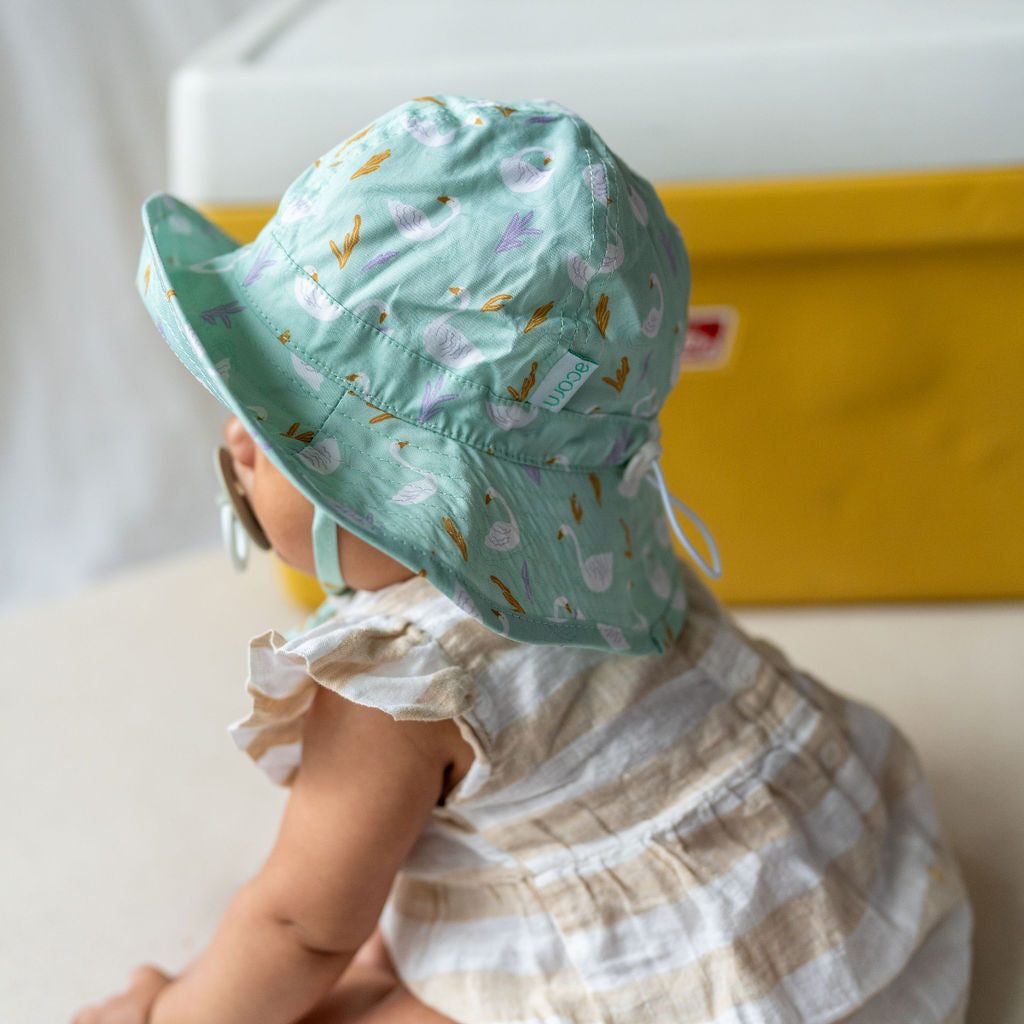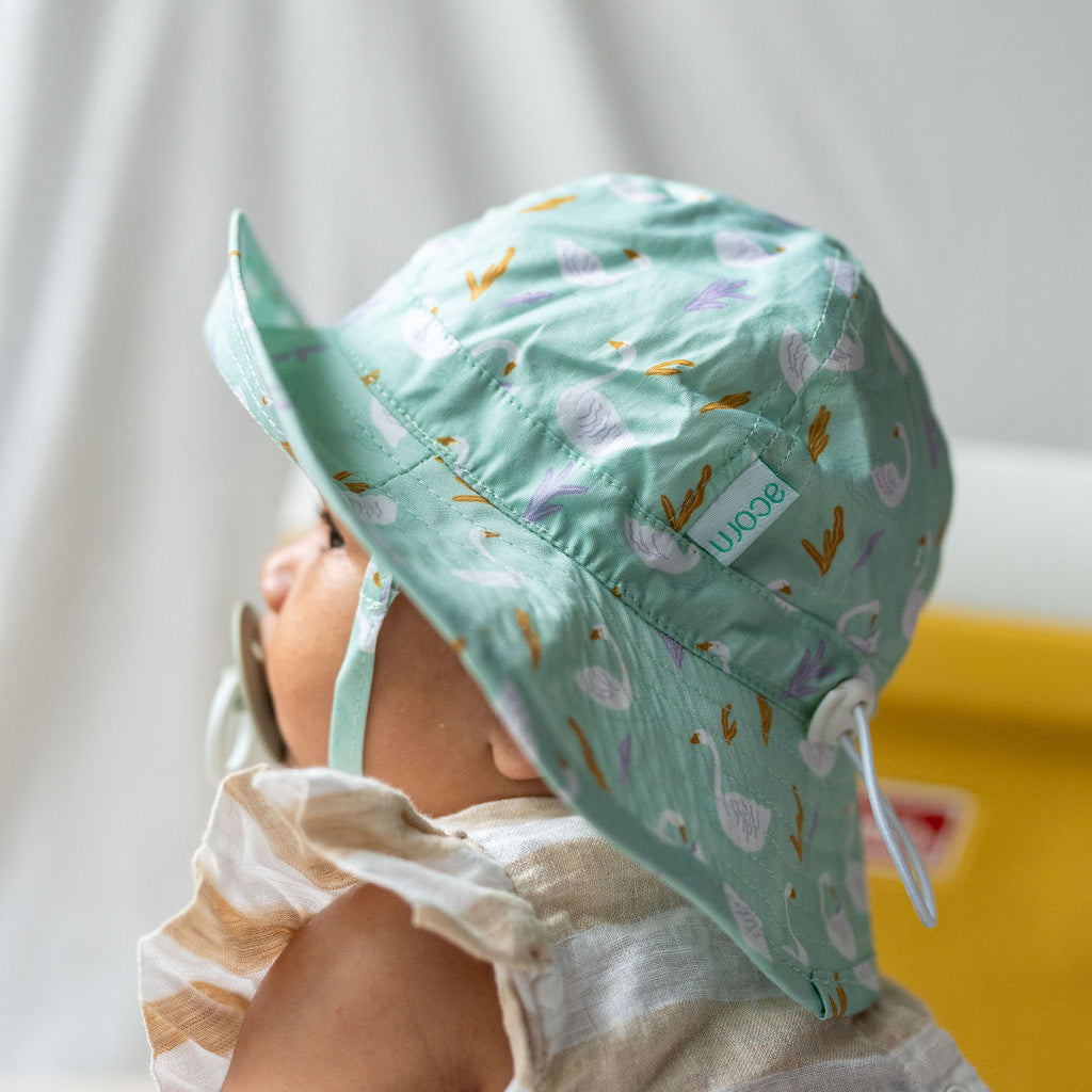 Baby sun hat with a sweet sweet mint based Swans prints, designed in Melbourne by local artist, Jacinta Weir.