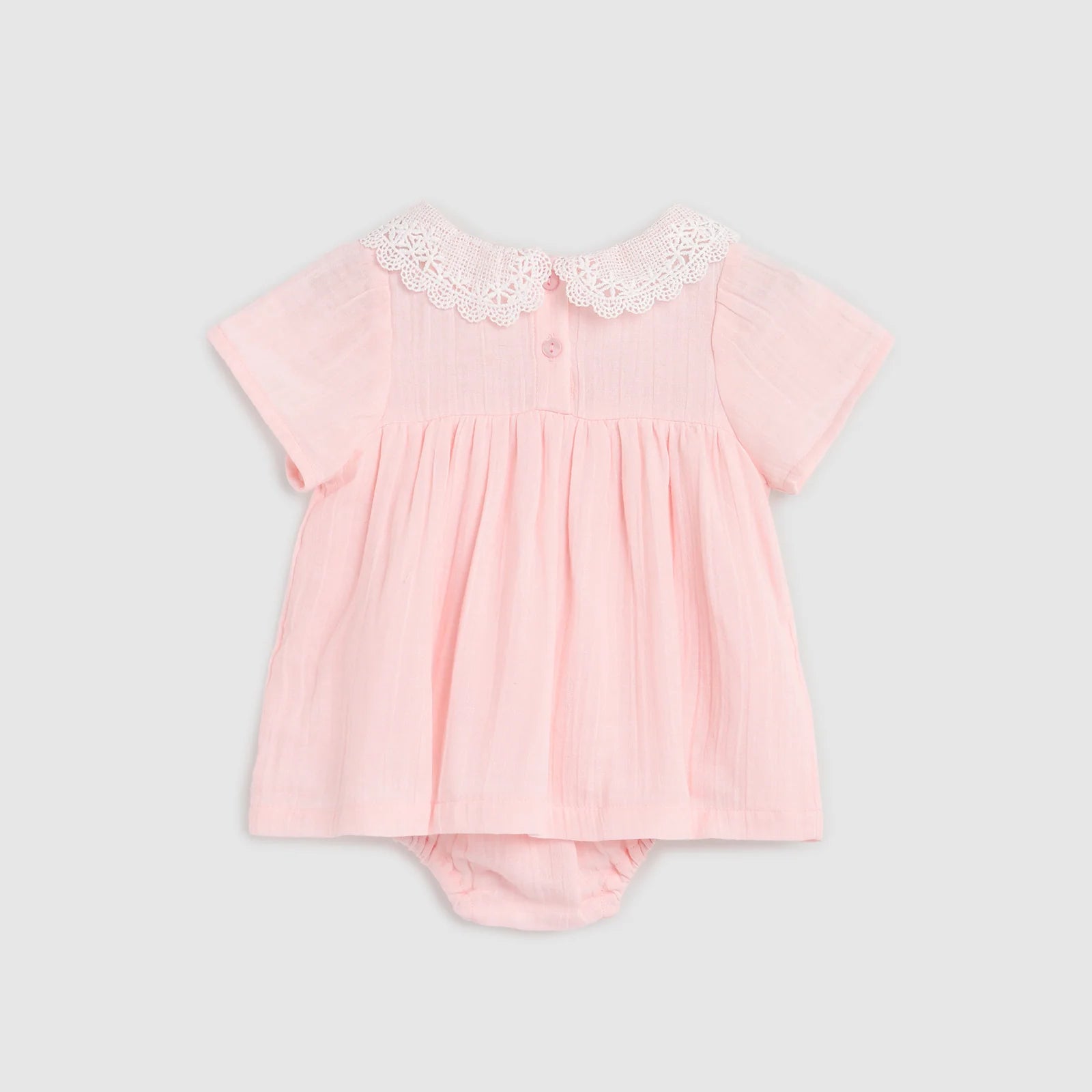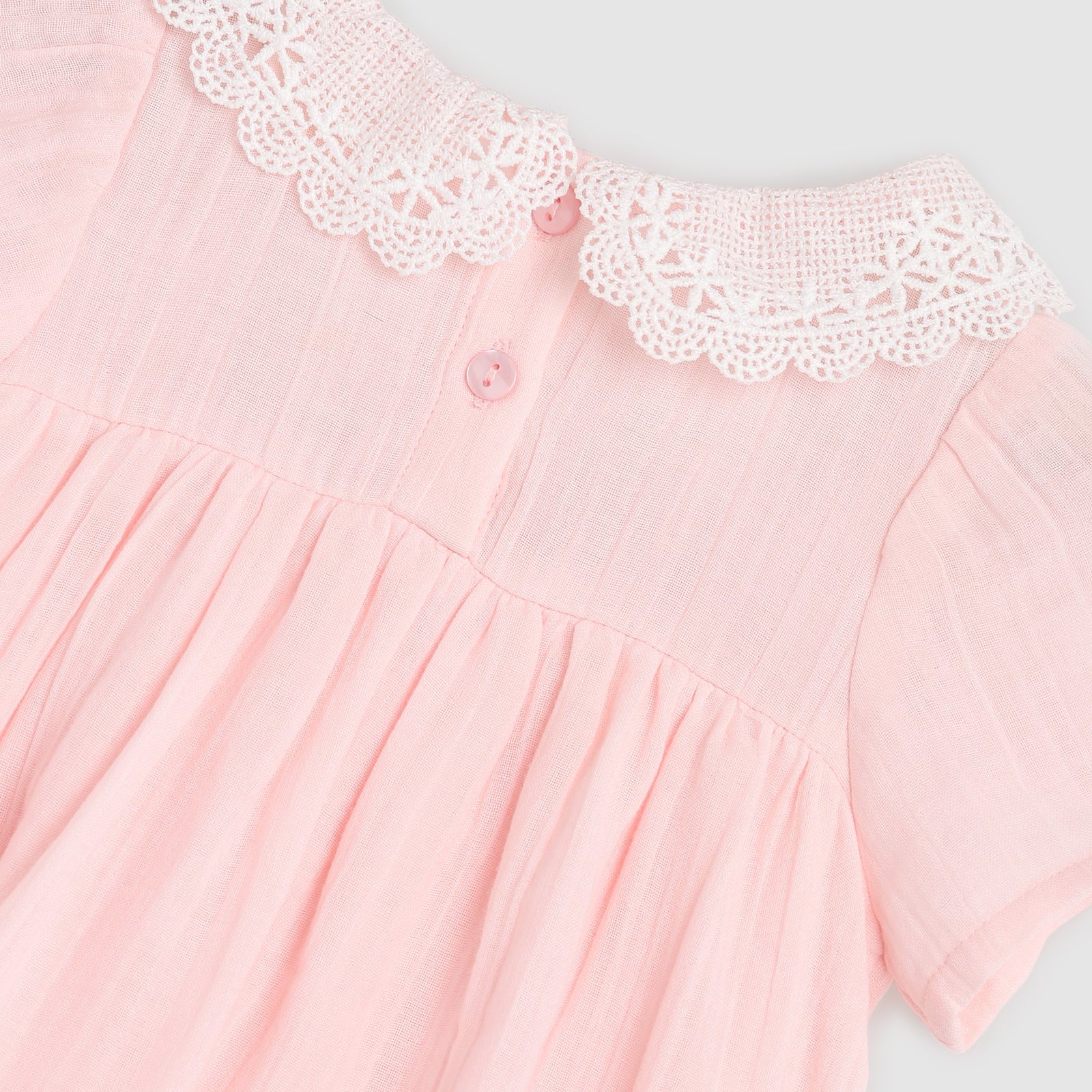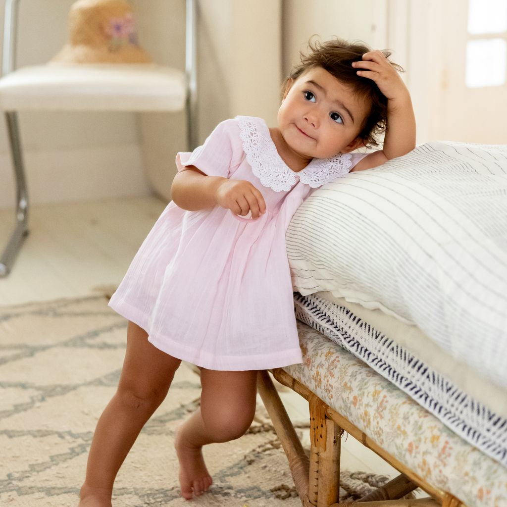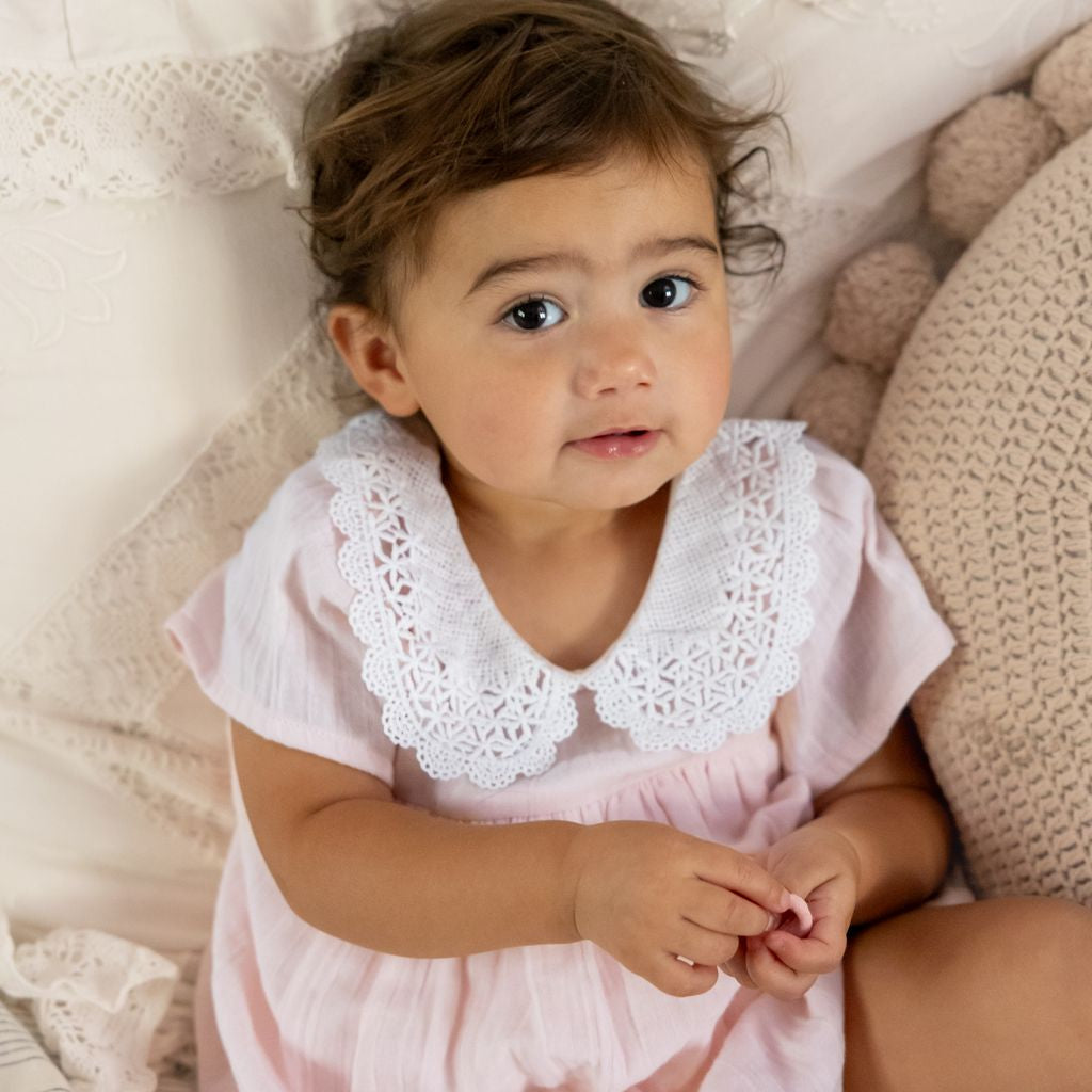 The Adele Baby Dress in Petal PInk is an elegant lace-collar dress and bloomer set.