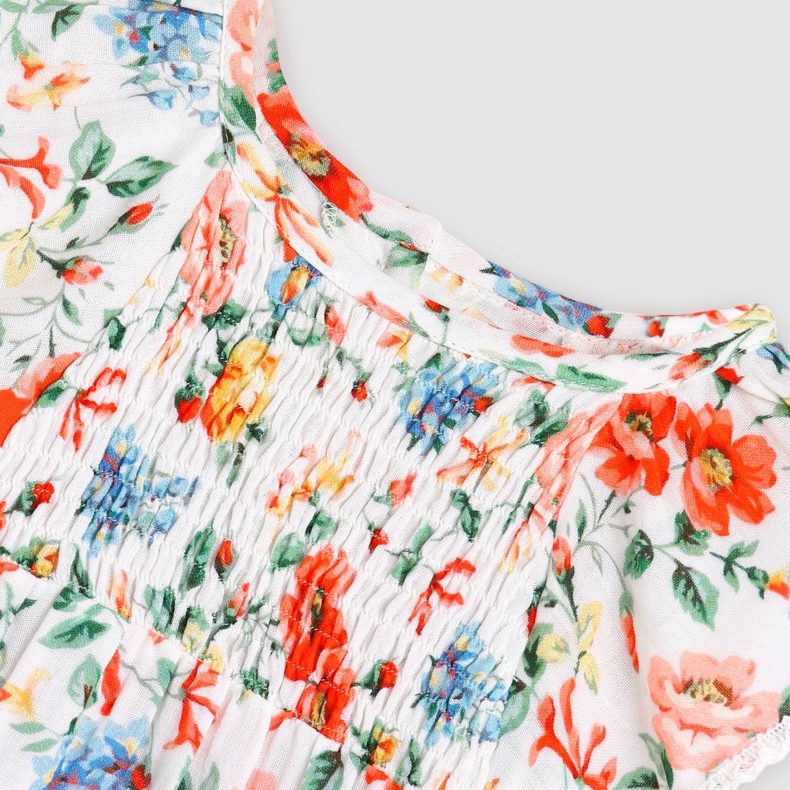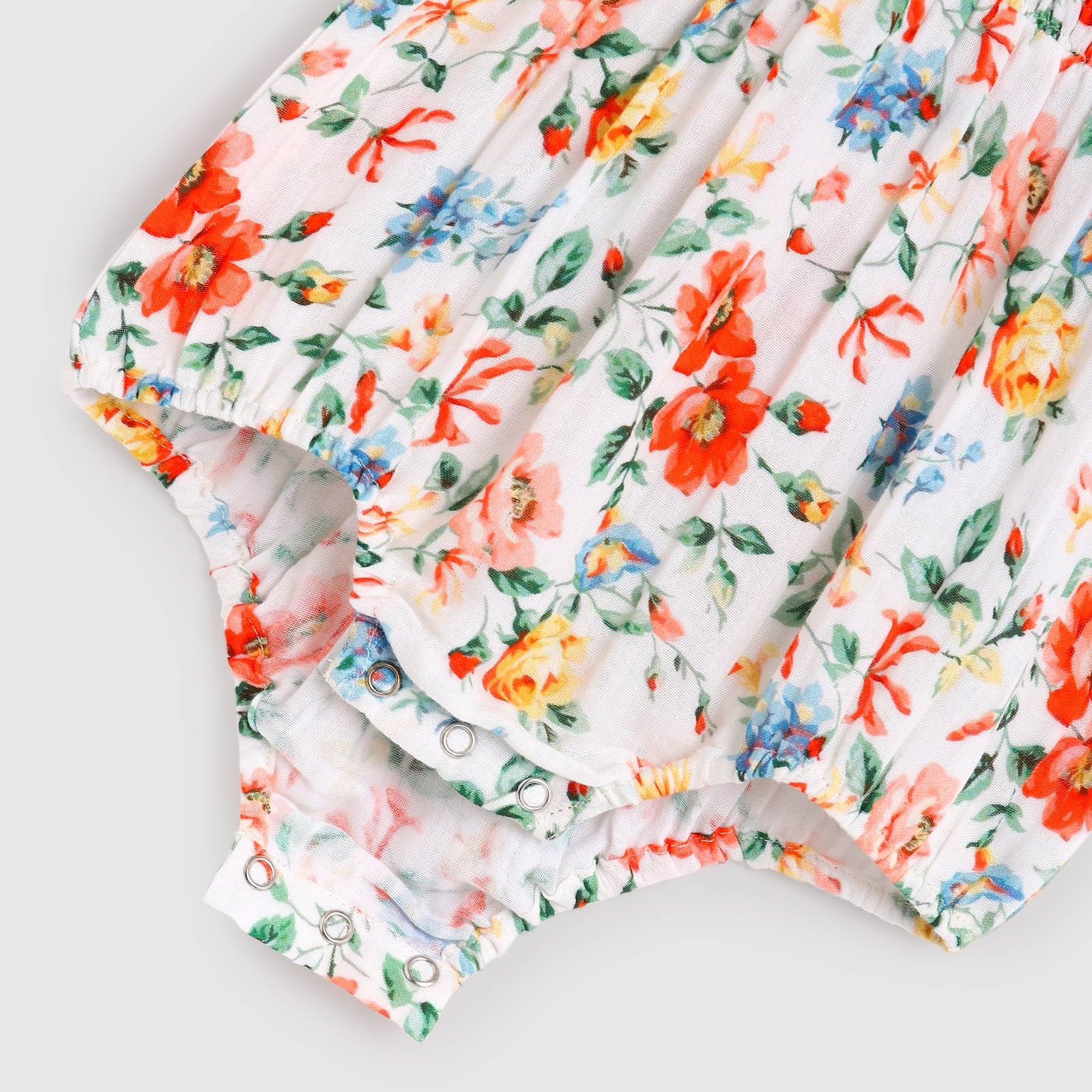 The Alice Playsuit in Pretty Floral features intricate shirring across the chest for a snug yet stretchy fit.