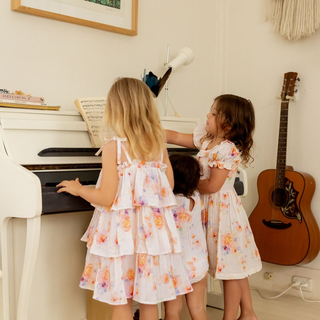 The Lucia Dress in Roses is a vibrant and playful design, perfect for sunny days and special occasions.
