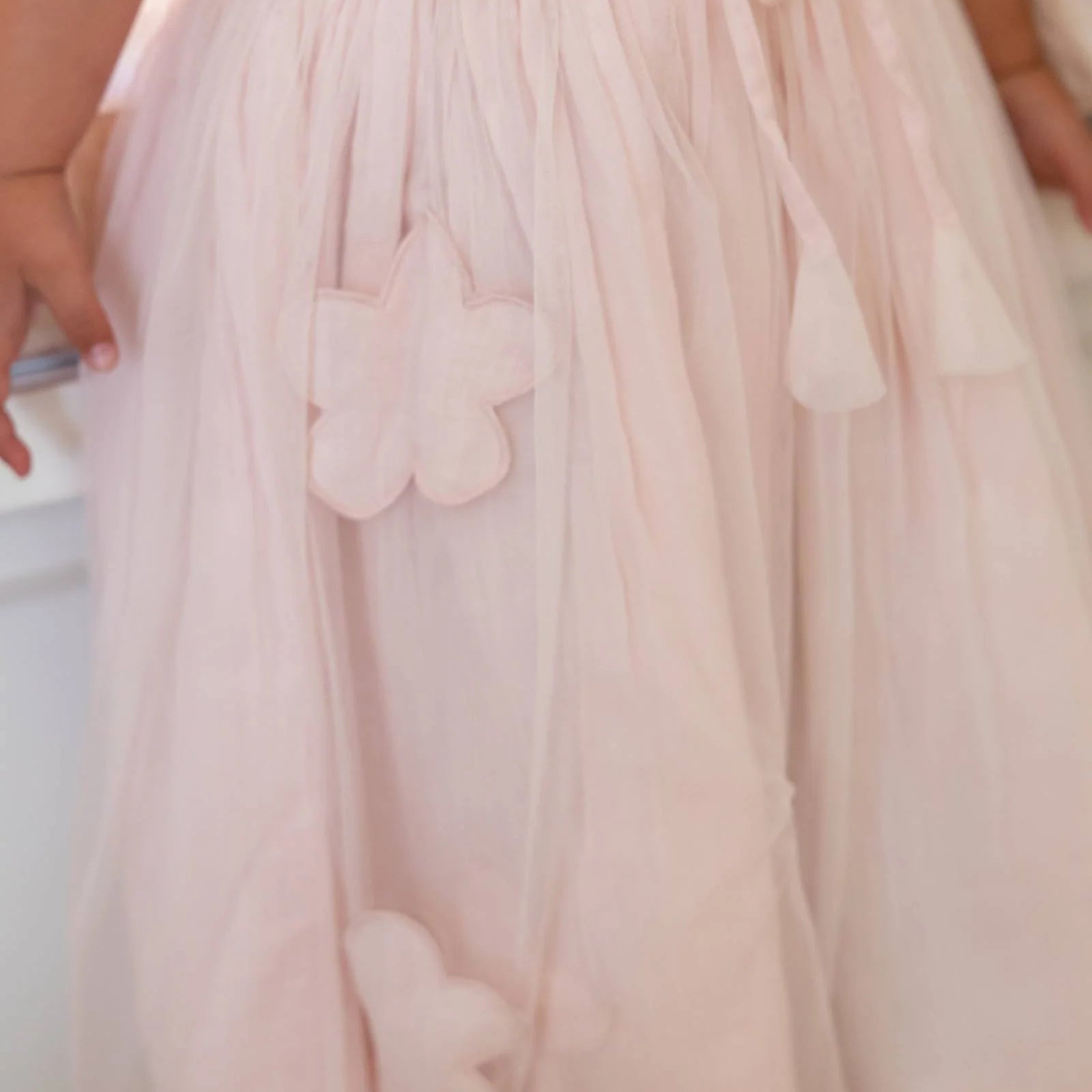 Designed with a soft, flowing tulle overlay and adorned with playful floral appliqués, this skirt is perfect for twirling and creating magical moments.