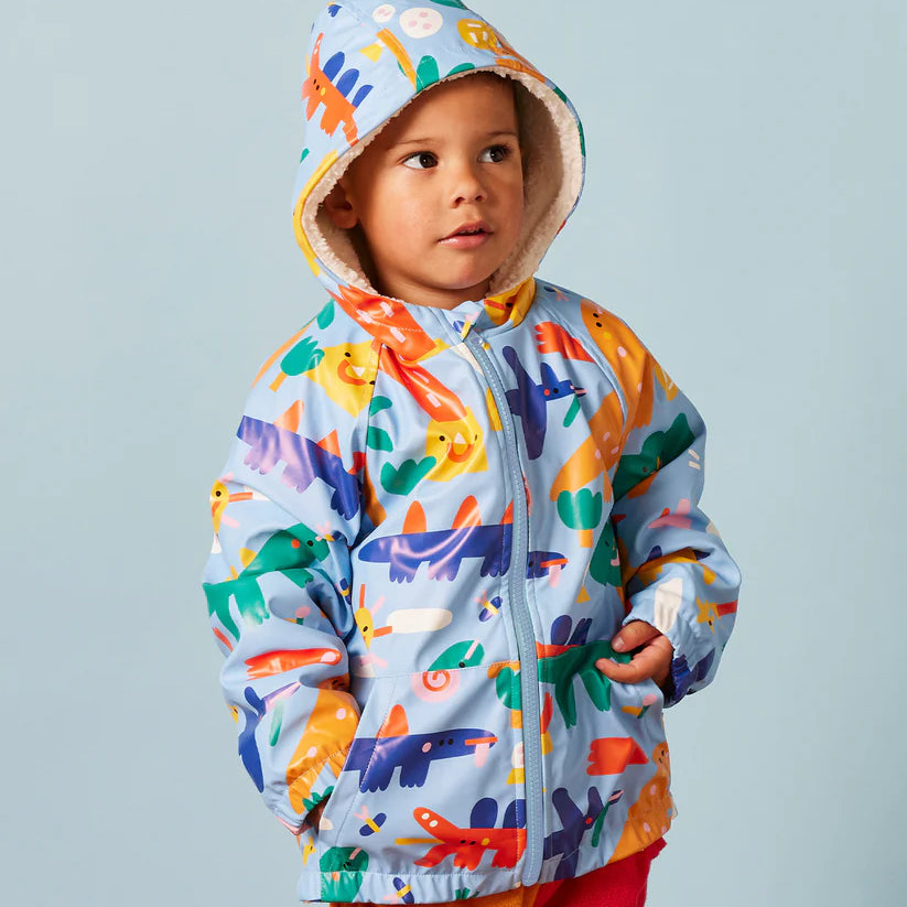 Dancing in the rain! Embrace the wet weather with this cosy and colourful hooded raincoat for babies and kids!
