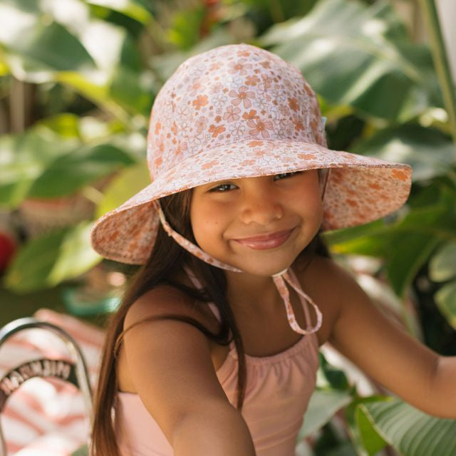 Bring a pop of colour to every summer day with this wide brim sunhat, featuring a stunning peach-toned vintage floral print on both the outside and inner brim, designed by Jacinta Weir from Two Little Ducklings. Perfect for pairing with any sunny-day outfit!