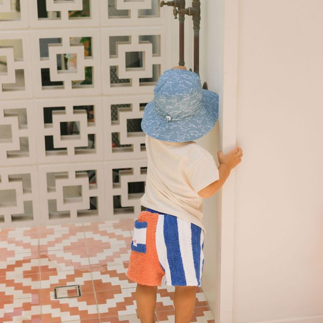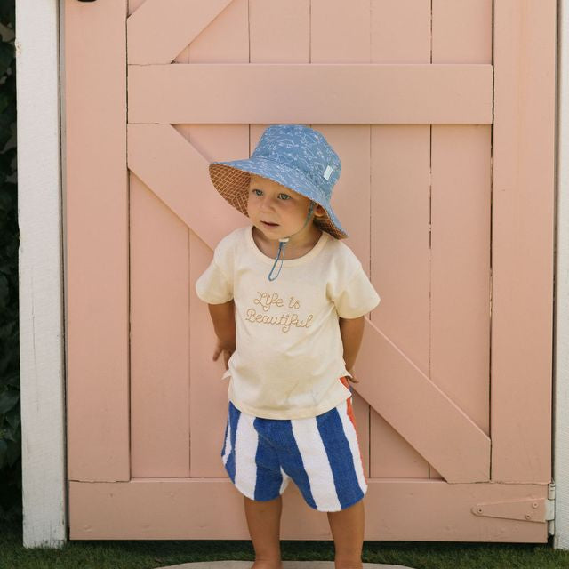 Bring a little roar to sunny days with this bucket hat featuring a bold print of lions, tigers, and cheetahs on the outside, paired with a chestnut and cream checks print on the inner brim. Both original designs are by Melbourne artist Jacinta Weir from Two Little Ducklings.