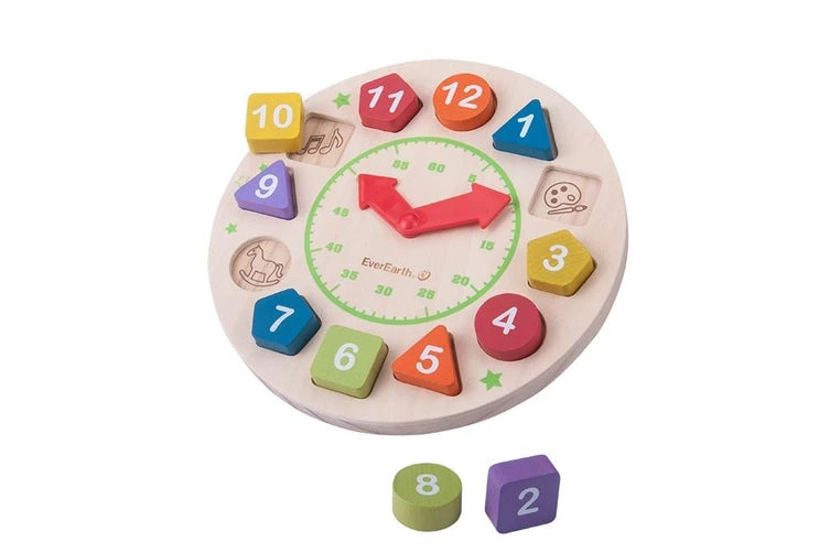 The Everearth Wooden Shape Sorting Clock is a classic toy, teaching time, colours and shapes.
