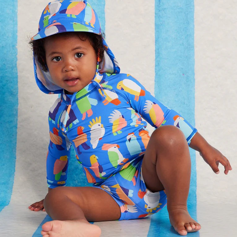 Our baby swim hat features protective neck flap, high stretch, UPF 50+, colourfast and pill resistant properties. Pair with our fun swimwear range to get the full look.